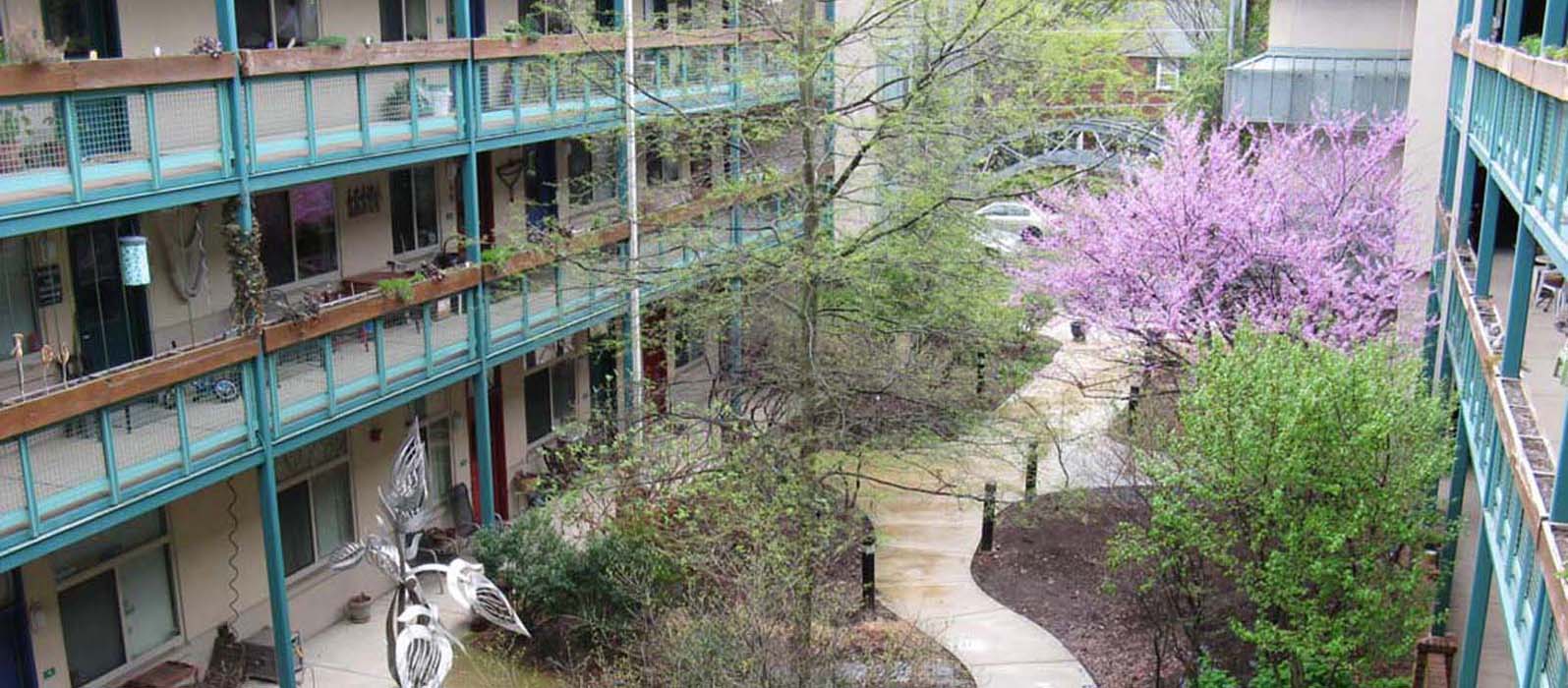 Eastern Village, un complesso di appartamenti di 55 unità situato in una zona commerciale di Silver Spring, nel Maryland, è un luogo piuttosto affascinante, considerando che un tempo ospitava gli squallidi uffici di un'associazione di assistenti sociali e poi è stato abbandonato per quasi un decennio, con l'acqua che gocciola dai soffitti. Quando l'ho visitata quest'estate, l'edera cadeva sulla facciata con tale esuberanza che non ho visto l'ingresso mentre passavo. Il cortile paesaggistico, strappato da un parcheggio, emanava fascino europeo. Alzando lo sguardo, vidi corridoi aperti fiancheggiati da balconi, fiori ed erbe aromatiche. Poi ho visto un uomo quasi calvo seduto a un tavolino rotondo che mi salutava. Doveva essere il rabbino Jason Kimelman-Block, un amico di un amico a cui avevo chiesto di portarmi in giro.